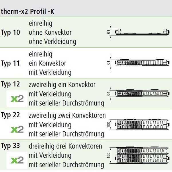 Успіх енергозберігаючих радіаторів therm-x2 грунтується на новітньому запатентованому принципі х2: послідовної обв'язки по теплоносію. Якщо в панельних радіаторах за колишньою технології все панелі нагрівалися одночасно, то згідно з принципами х2 теплоносій з трубопроводу, що подає спочатку надходить в передню панель. У режимі нормальної експлуатації потужності передній панелі зазвичай досить, а задня панель виконує функцію відбиває екрана.