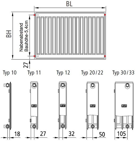 Профільний радіатор у стандартному виконанні, вироблений відповідно до високих стандартів якості Kermi, пропонує широкий вибір можливостей підключення, оскільки з боків розташовуються чотири виходи. Панельний радіатор з високою тепловою потужністю – те, що потрібно при низьких температурах в трубопроводі.