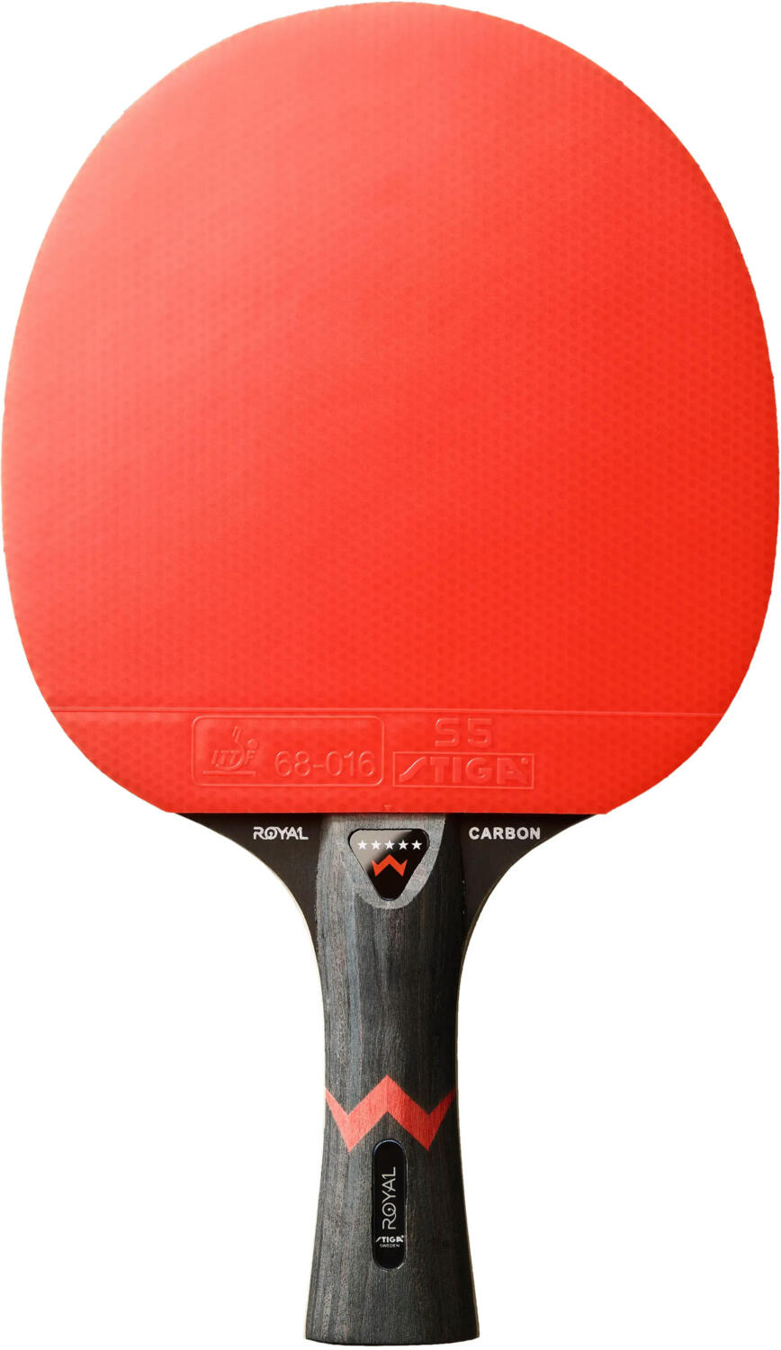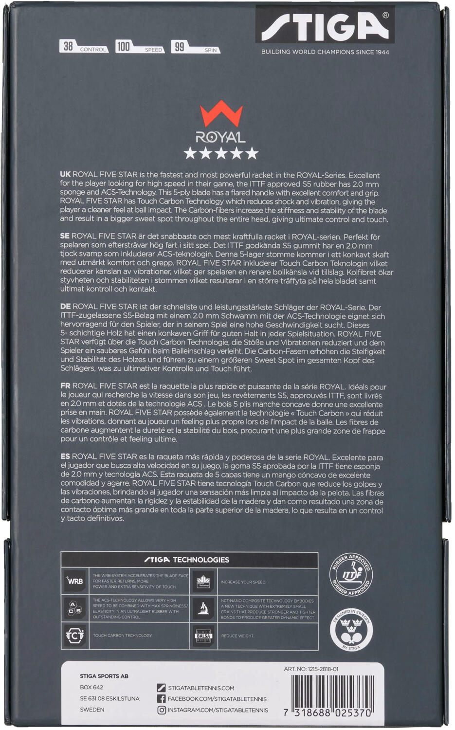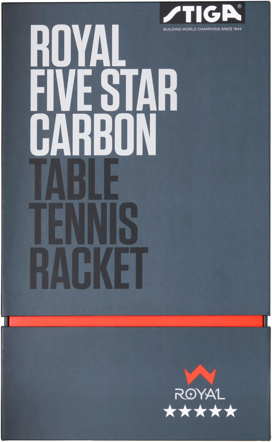 Royal Five Star Carbon від STIGA — найшвидша та найпотужніша ракетка в серії Royal, створена для атакувальних гравців, які прагнуть ще більшої швидкості та точності у своїй грі. Основа ракетки складається з 5 шарів деревини та 2 шарів карбонового волокна, а також покрита гумою, схваленою ITTF. Додавання карбону підвищує жорсткість і стабільність леза, що дає змогу досягти максимальної потужності ударів, чудового контролю та чіткого відчуття м’яча.