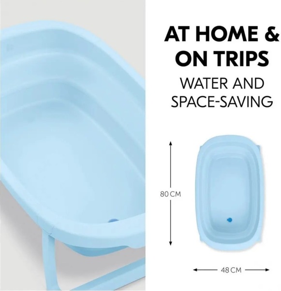 Для розкладання розкладіть обидві ніжки та натисніть на дно. Коли дитина закінчить купатися, можна швидко злити воду за допомогою пробки. Щоб скласти порожню ванну, переверніть її догори дном, натисніть на дно і складіть ніжки. В складеному вигляді 80x48x9 см дитячу ванночку можна зберігати в шафі, на полиці, або під ліжком - ідеальний варіант для невеликих квартир або подорожей.