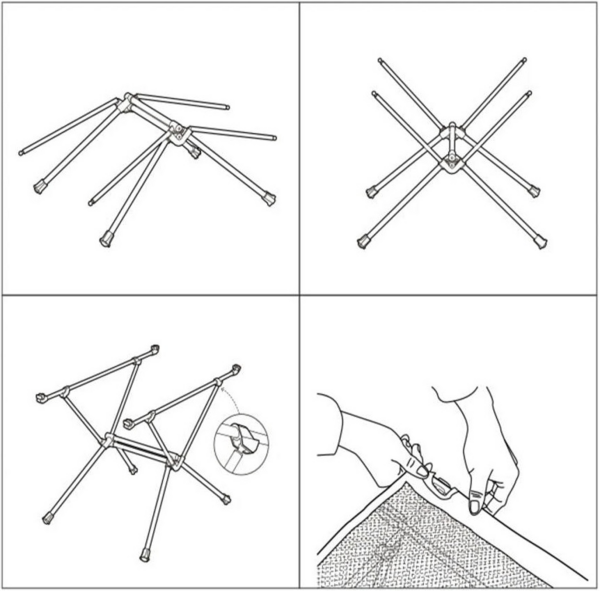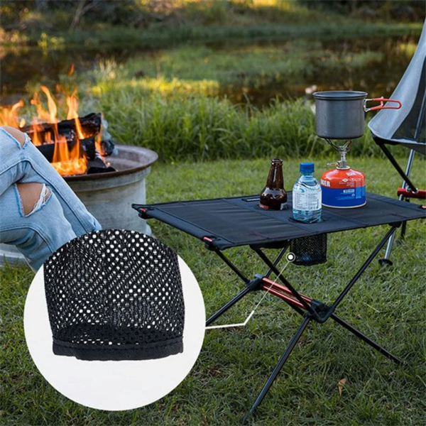 Стільниця виконана із сітки, що вирізняється міцністю, тому ви можете без побоювання розмістити на столі все, що вам потрібно. У столі є 2 спеціальні кишеньки з нейлону - в них можна розмістити дрібне сміття, пляшки з водою і не тільки. Каркас зроблений з алюмінієвого сплаву, який витримує навантаження до 30 кг. Розкладається виріб шляхом встановлення кронштейнів з АБС-пластика.