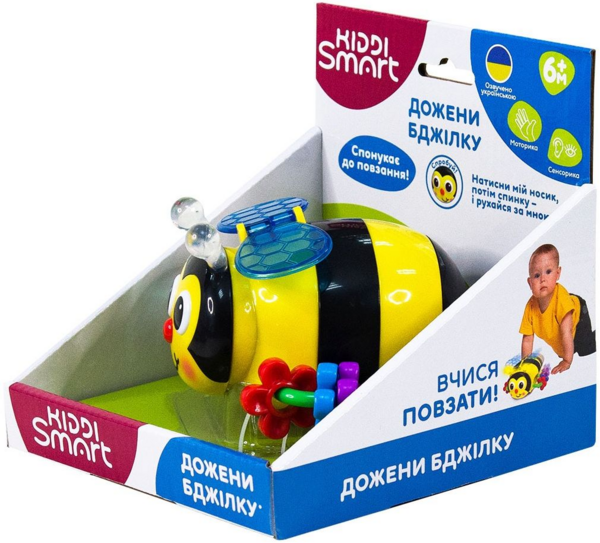 Нехай малюк проводить час із користю та веселощами з розвивальною іграшкою KIDDI SMART - ДОЖЕНИ БДЖОЛУ! Вона заохочує малечу повзати та намагатися її наздогнати, адже бджілка блимає сяючими вогниками, кумедно рухається, співає завзяті пісеньки, ще й має барвистий дизайн! Живлення 2 батарейки типу ААА (входять до комплекту). Рекомендовано для дітей віком від 6 місяців.