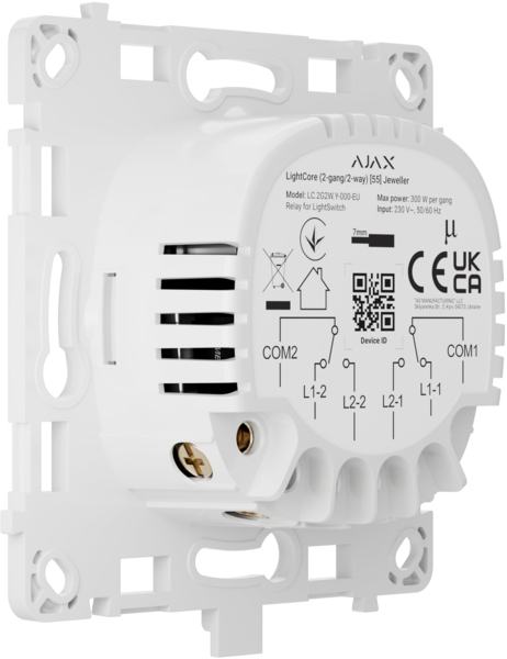Реле двоклавішне прохідного типу Ajax LightCore – це компонент системи розумного дому Ajax, який дозволяє контролювати освітлення за допомогою двох клавіш.