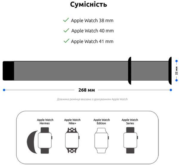| Сумісність | Apple Watch 38 mm, Apple Watch 40 mm, Apple Watch 41 mm, Apple Watch 42 mm |