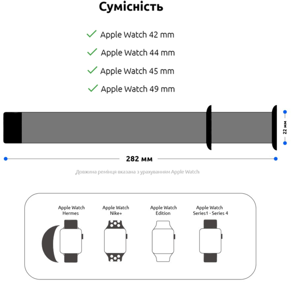 | Сумісність | Apple Watch 42 mm, Apple Watch 44 mm, Apple Watch 45 mm, Apple Watch 46 mm, Apple Watch 49 mm |
