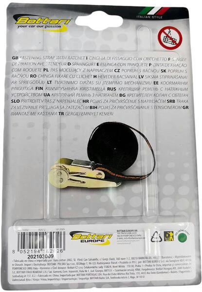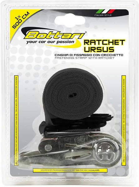 Стяжний ремінь Ursus від Bottari призначений для надійної фіксації та кріплення різних вантажів під час їх транспортування. Для якісного затягування стрічки використовуються спеціальний храповий механізм, який дає змогу надійно закріпити вантаж, у такий спосіб запобігаючи його випадінню, втраті та пошкодженню. Крім цього, використання стяжного ременя дає змогу значно поліпшити стабільність вантажу і забезпечити його нерухомість на весь час транспортування. Якісна фіксація вантажу є запорукою безпеки дорожнього руху, оскільки нерідко недбале ставлення до стійкості та кріплення вантажів, що перевозяться, створює аварійні ситуації. Щоб уникнути виникнення таких ситуацій і використовуються стяжні ремені. Ремінь виконаний з поліестерових волокон, які утворюють дуже міцну і зносостійку стрічку, здатну виконувати свою роботу навіть у важких погодних умовах. Має високу стійкість до розриву та пошкоджень. Завдяки компактному розміру ременя в складеному вигляді ви зможете без зусиль знайти для нього місце в багажнику, щоб дістати та закріпити вантаж за необхідності.