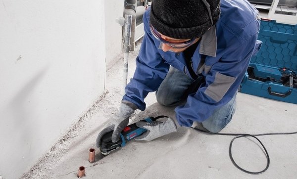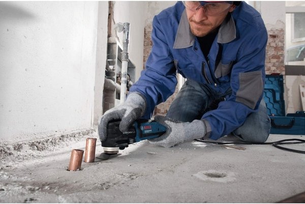 300-ватний універсальний різак Bosch GOP 30-28 Professional з налагоджувати від 8000 до 20000 числом коливань. Амплітуда розгойдування вліво/вправо 1,4°. Розпилює і розрізає матеріали з деревини, синтетичні, легкі будівельні матеріали, метали, зачищає, шліфує, Шабр невеликі поверхні, обробляє керамічну плитку. Комфортний для роботи урівень, біля краю. Кріплення насадок Starlock і Starlock Plus. Пристрій відсмоктування пилу. Мультиінструмент йде з пильним диском по дереву і металу.