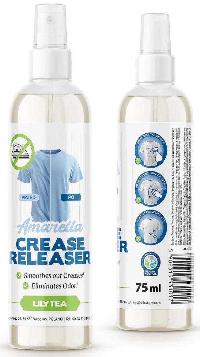 Відкрийте для себе класичну елегантність з рідкою праскою Amarella. Позачасова суміш, яка надає вашим тканинам свіжий, вишуканий аромат. Ідеально підходить для тих, хто цінує нотку вишуканості у своїх повсякденних речах. Засіб для розгладження складок - революційне рішення для безпроблемного прасування одягу за лічені хвилини. Розроблений для насиченого способу життя, цей революційний спрей позбавляє від необхідності традиційного прасування - просто розпиліть, повісьте і спостерігайте, як зморшки зникають. Безпечний для різних тканин, він ідеально підходить для всього, від повсякденного одягу до делікатного вечірнього вбрання. Ідеальний для тих, хто прагне до зручності та ефективності, цей інноваційний продукт легко освіжає одяг, допомагаючи вам виглядати бездоганно і доглянуто без зайвих зусиль. Спростіть свій режим прання за допомогою засобу для розгладження складок і відкрийте нову еру легкого догляду за одягом.