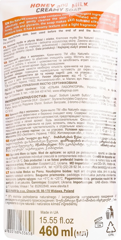 Рідке крем-мило Bio Naturell Мед та молоко дой-пак 460 мл