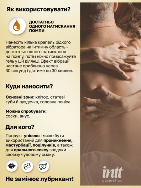 - Для мастурбації - нанесіть 1 краплю на член або на клітор (1 крапля = 1 натискання), і пестіть себе, насолоджуючись незвичайними відчуттями, при необхідності можна додати гель;