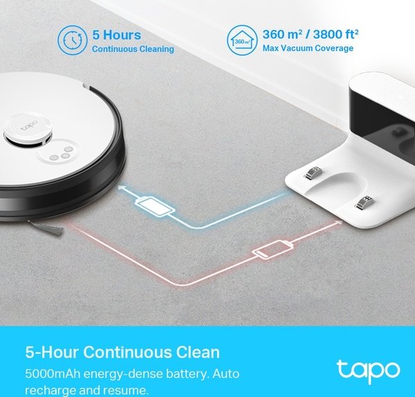 Tapo RV30 забезпечує 5 годин безперервного прибирання всього будинку після повного заряджання. Робот автоматично повертається до зарядної станції, коли заряд батареї стає низьким, а потім перезапускається з того місця, де зупинився.