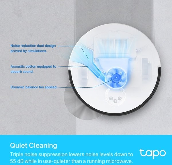 Потрійне шумозаглушення знижує рівень шуму до 55 дБ під час використання – тихіше, ніж працююча мікрохвильова піч. Tapo прибирає ваш дім, не турбуючи вас і ваших домашніх тварин.