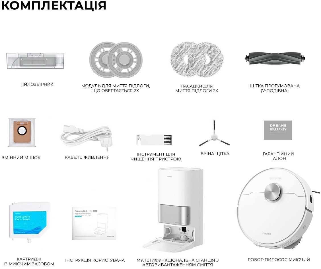 | Комплектація (можливі зміни в різних поставках) | Бічна щітка, Тримач насадки – 2 шт., Док-станція заряджання та самоочищення, Документація, Інструмент для чищення, Кабель живлення, Мішок для пилу, Миючий засіб, Насадка, Насадка для миття підлоги – 2 шт., Пилозбірник, Робот-пилосос |