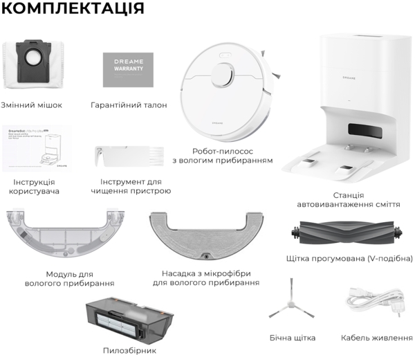 | Комплектація (можливі зміни в різних поставках) | Блок для вологого прибирання, Бічна щітка, Док-станція заряджання та самоочищення, Документація, Інструмент для чищення, Кабель живлення, Насадка з мікрофібри, Пилозбірник, Робот-пилосос, Центральна щітка |