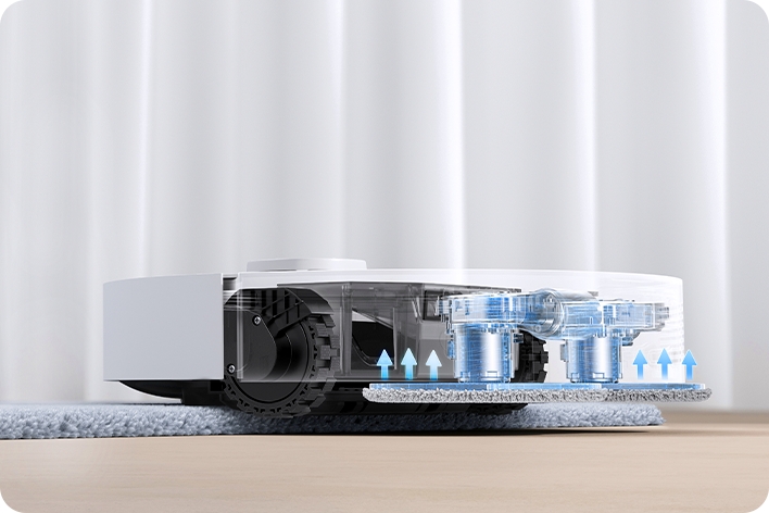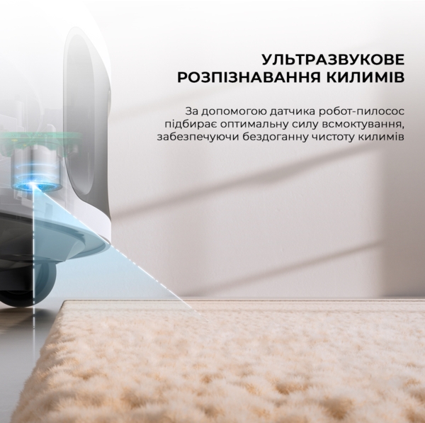 Нове покриття — новий виклик, і Dreame впорається. Його розумні датчики не тільки відрізняють тверду підлогу від килимів, але і визначають, наскільки високий ворс. Щоб зібрати пил без втрати потужності, робот просто адаптується. Більше ворс — більше всмоктування. Щоб килим залишився чистим і сухим, насадки-швабри автоматично піднімаються на висоту 10,5 мм.