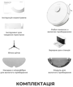 | Комплектація (можливі зміни в різних поставках) | Блок для вологого прибирання, Бічна щітка, Документація, Зарядна док-станція, Інструмент для чищення, Насадка з мікрофібри, Робот-пилосос |