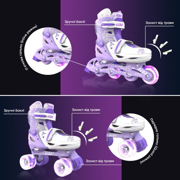 Це набір включає відразу два типу роликових ковзанів Inline та Quad. Саме завдяки такій варіативності набір Neon Combo Skates буде зручним та корисним для дитини, якій тільки належить освоїти цей спорт. Навчання буде проходити найбільш продуктивно і дозволить безпечно освоїти ролики використовуючи переваги кожного з типів.