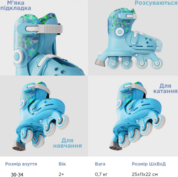 | Комплектація (можливі зміни в різних поставках) | Роликові ковзани |