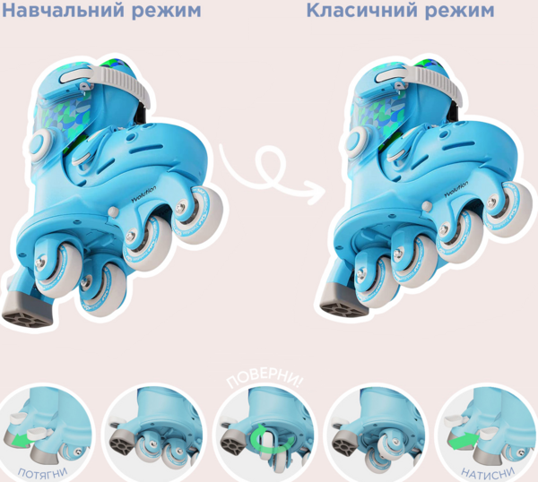 Дитячі ролики Yvolution Switch Skates дозволяють дитині навчитись кататись з раннього віку. Взуття регулюється в 5-х розмірах (від 30 до 34). Стабільні, завдяки паралельним колесам, ці ролики дозволяють вашій дитині зберігати рівновагу. Для того, щоб розташувати колеса в одну лінію - достатньо лише натиснути кнопку, і мчати вперед.
