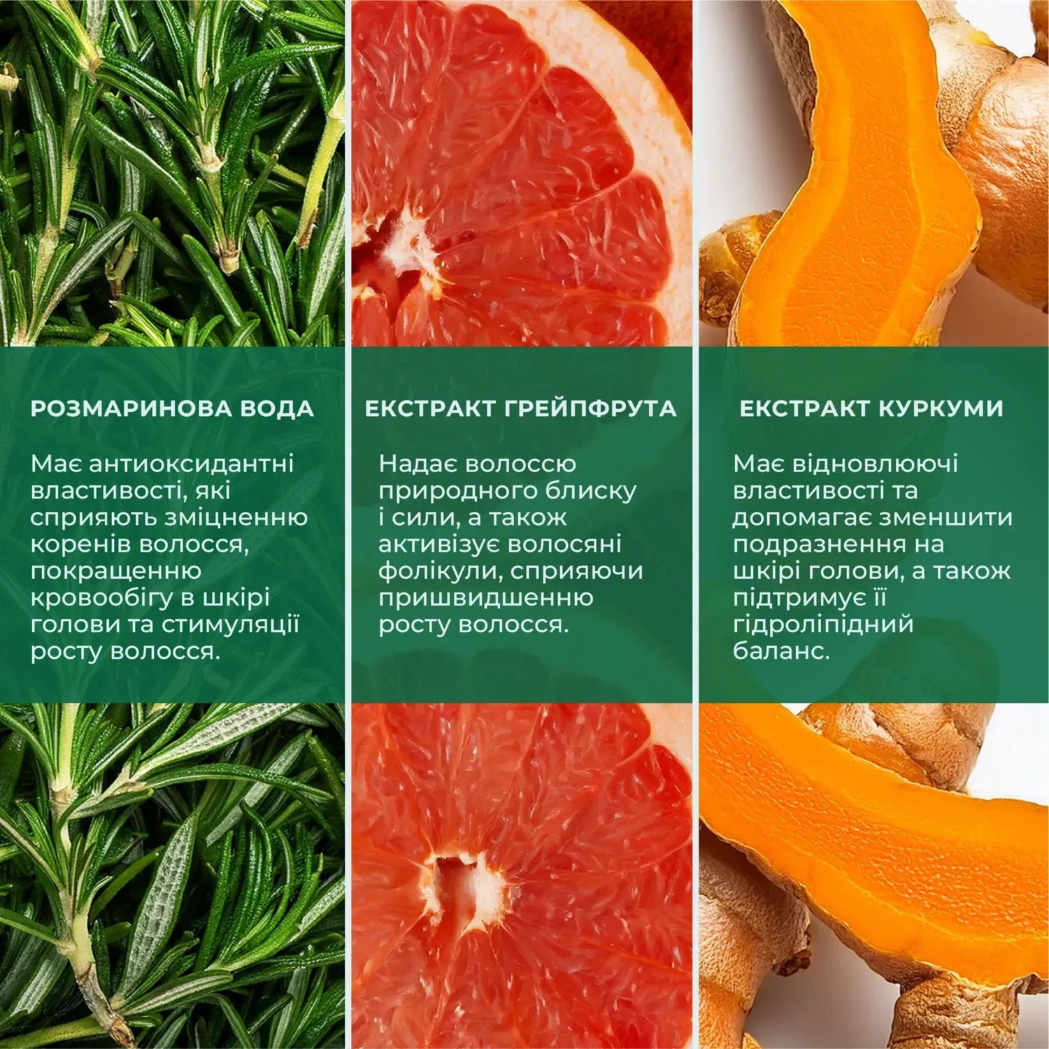 - Екстракт грейпфрута: надає волоссю природного блиску і сили, а також активізує волосяні фолікули, сприяючи пришвидшеному росту волосся;