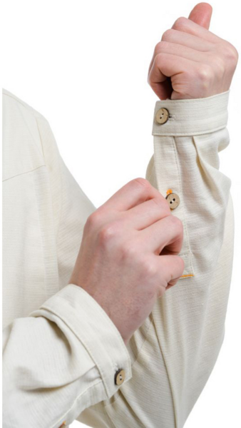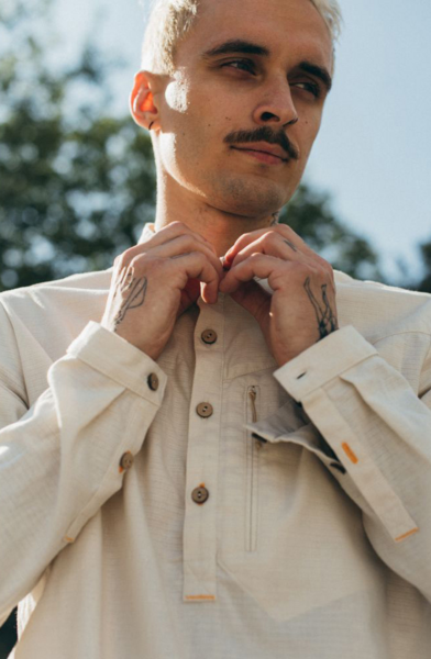 - Натуральний матеріал із вмістом коноплі та переробленим поліестером. Сорочка стала більш компактною і легкою, швидко сохне.