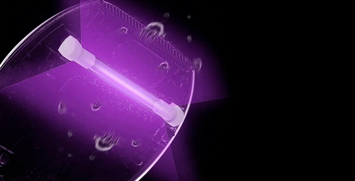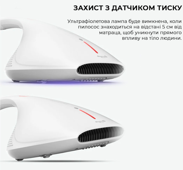УФ-лампа має закриту конструкцію, вона захищена корпусом, щоб мінімізувати прямий контакт людини з променями. Світло UV-C ефективно діє лише на ті частини поверхні, з якими контактує пилосос. Промені не потраплять на шкіру або в очі навіть випадково — адже лампа автоматично вимикається, якщо пристрій підняти або нахилити.