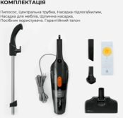 | Комплектація (можливі зміни в різних поставках) | Документація, Насадка для м'яких меблів, Пилосос, Ручка, Фільтр, Щілинна насадка, Щітка |