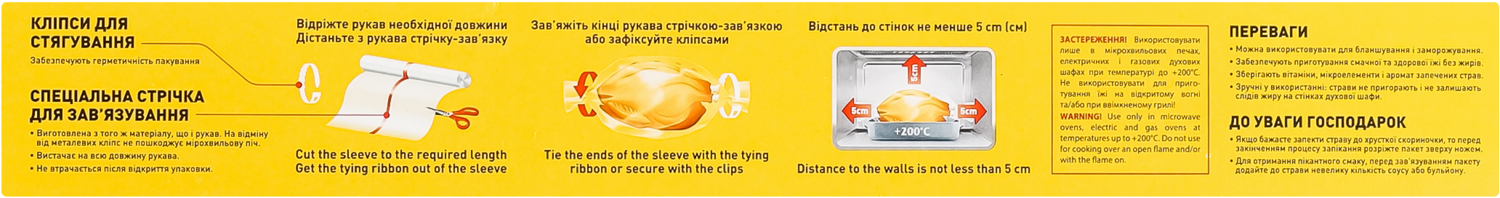 Термостійкий аксесуар для приготування здорових страв у духовці. Призначений для використання в електричних, газових духових шафах та мікрохвильових печах. Рукав постачається зі зручною термостійкою стрічкою для зав'язування.