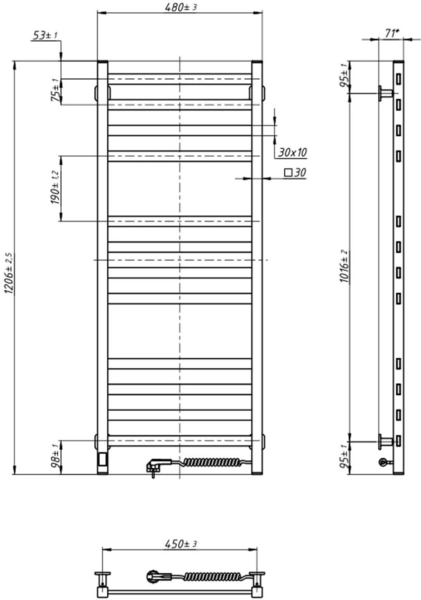 Електрична рушникосушарка виготовлена з високоякісної вуглецевої сталі, яка забезпечує довговічність, стійкість до механічних пошкоджень та надійність при щоденному використанні. Конструкція передбачає бічні колектори (стійки) з профільної труби 30×30 мм та горизонтальні перемички з трубок 30×10 мм. Завдяки оптимальній товщині стінок, рушникосушка демонструє високу тепловіддачу та міцність конструкції. Поверхня вкрита порошковою фарбою, яка забезпечує захист від корозії та зберігає естетичний вигляд протягом багатьох років.