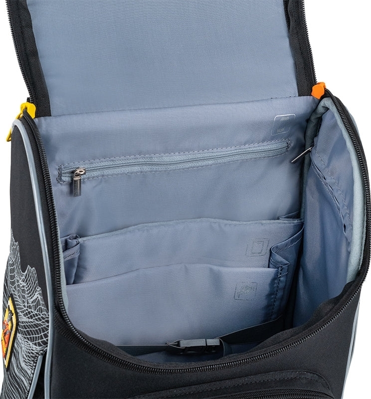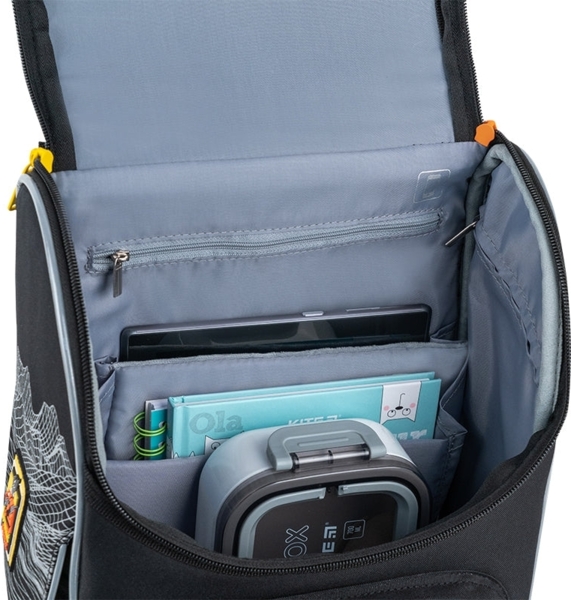 Ця модель допоможе непосидам підтримувати порядок всередині рюкзака, адже рюкзак вміщує папки, книги та зошити формату A4. Завдяки стійкому щільному каркасу, рюкзак завжди відмінно тримає форму – тож зошити будуть зберігатися рівненькими та охайними. Каркасна форма допомагає дитині легше систематизувати речі та змалку привчатися до порядку. А в об’ємну передню кишеню вміщується пенал чи ланч-бокс, що суттєво економить місце в основному відділенні. Комфортна спинка, зручний функціонал і привабливий дизайн: зразкова модель для початкової школи допоможе дитині легко та швидко влитися в навчальний процес. Значки-підказки допомагають швидко орієнтуватися у вмісті рюкзака.