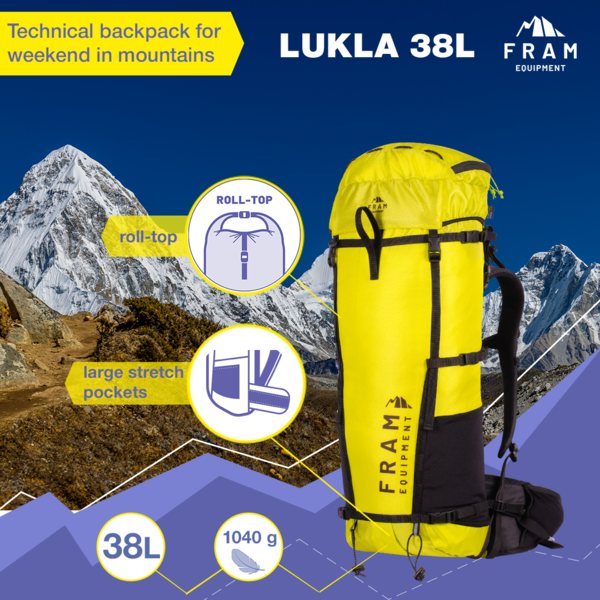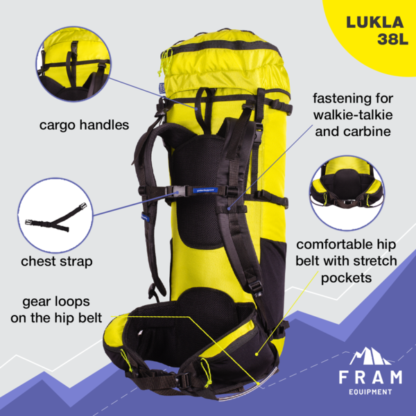 Lukla 38 - рюкзак для вікенду у горах. Має ідеальний розмір та форму для невеликих подорожей і тренувань. Чудово підійде для походу в Карпати на двох - легкий намет, два спальника, кухня, тепла річ. Або зібрати комплект для тренувань - мотузка, система, спорядження, кішки та інструменти. Чи для трекінгу в бейс кемп Евересту, зі своїм спальним мішком і легким утепленням.