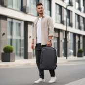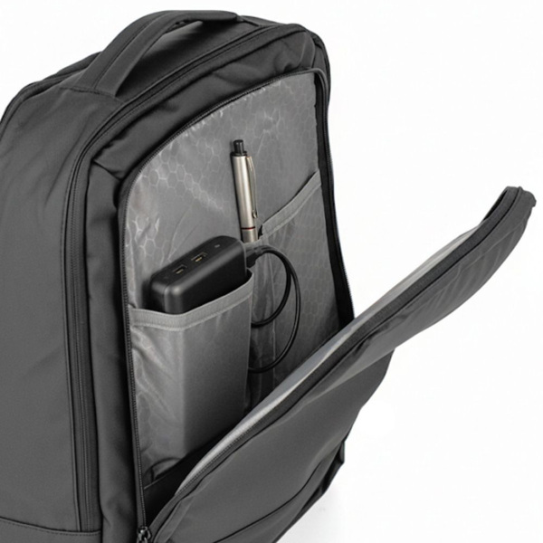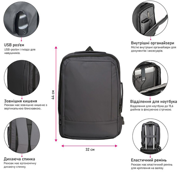 - Рюкзак має два великі відділення з органайзером для ноутбука та аксесуарів, а також зовнішню кишеню з вертикальною блискавкою;