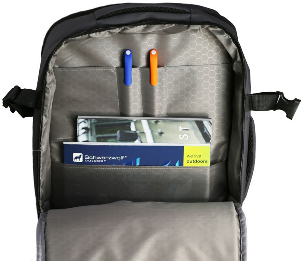 - Перше відділення має декілька внутрішніх кишень відкритого типу, друге відділення призначене для одягу, який фіксується стрічками, є велика кишеня, куди можна покласти записник чи книжку;