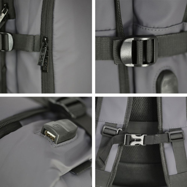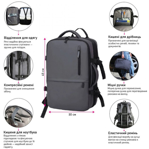 - Рюкзак обладнаний міцною ручкою для перенесення, а також має ручку на бічній панелі й може перетворитися в невеличку валізу;