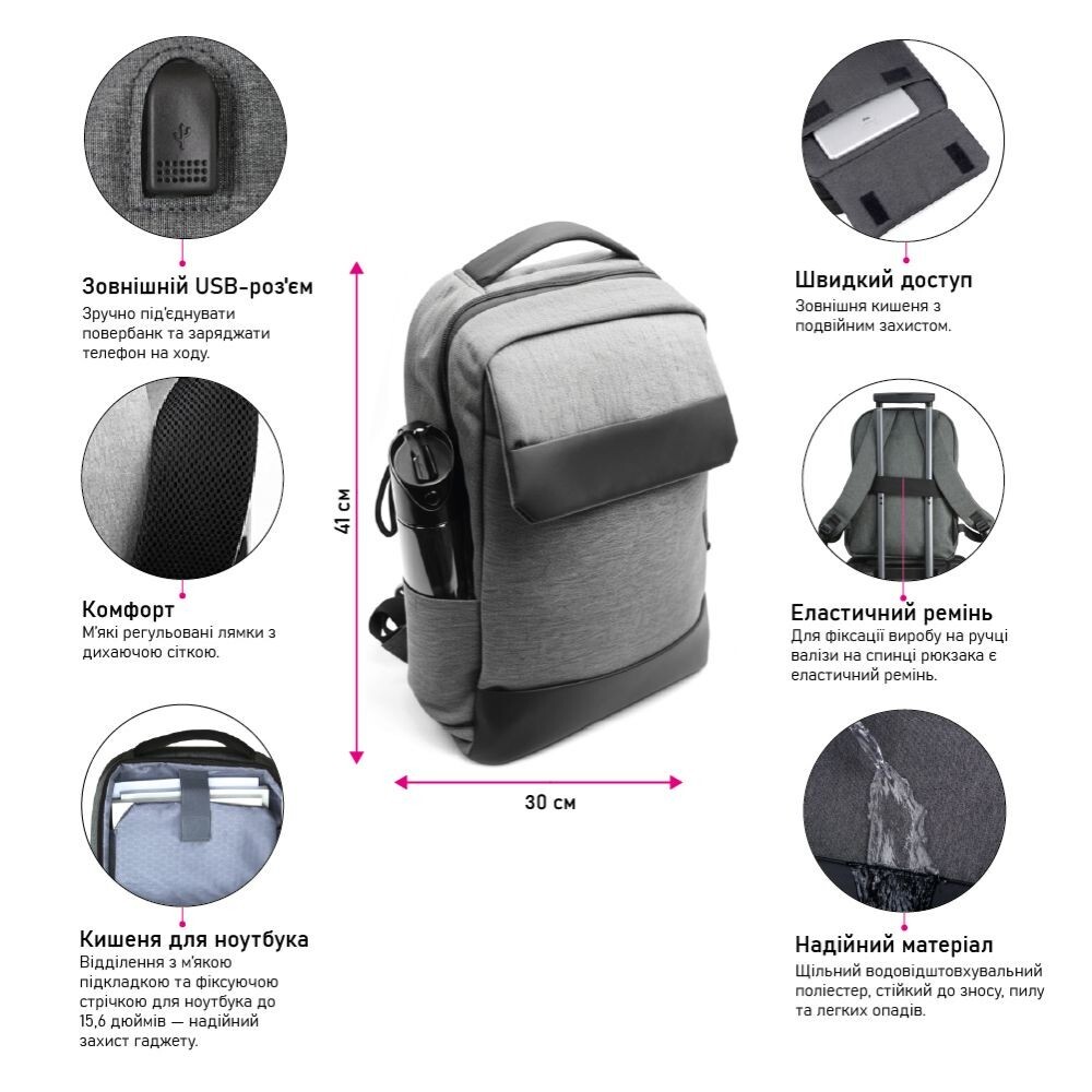 | Особливості конструкції | Внутрішня кишеня, Кишеня для пляшки, Відділення для ноутбука, Передня кишеня |