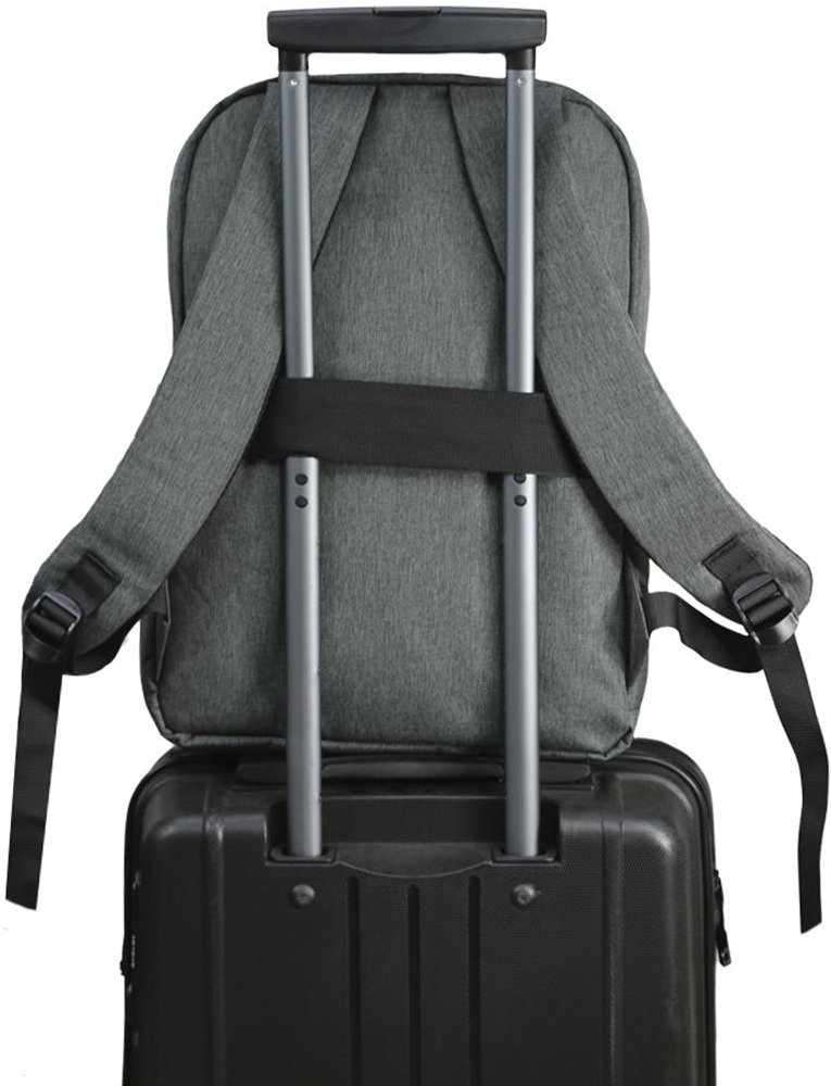 - Для фіксації виробу на ручці валізи на спинці рюкзака є еластичний ремінь. Рюкзак обладнаний міцною ручкою для перенесення.