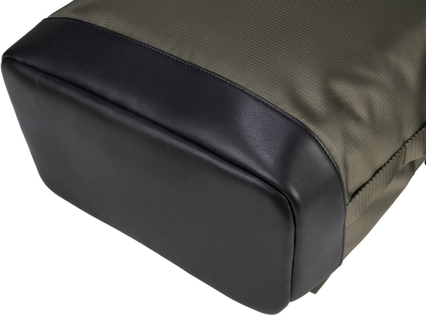 - Рюкзак виготовлений з тканини, виробленої з переробленого пластику, має шкіряні вставки.