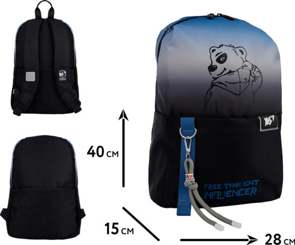 Спинка рюкзака ущільнена спіненим поліетиленом, завдяки чому він добре тримає форму. Ущільнене дно не провисає під вагою вмісту. Анатомічні лямки з м’яким ущільненням забезпечують комфорт під час носіння. Рюкзак має чотири кишені: передня забезпечує швидкий доступ до найнеобхіднішого, потаємна на спинці надійно сховає цінні речі, а дві бічні підходять для пляшки з водою або дрібних предметів. Градієнт у стриманих кольорах разом з елегантним чорним, який завжди популярний серед тінейджерів, в рюкзаку Yes T-105 Thought Influencer, втілює в собі ідеальне поєднання мінімалістичного дизайну та сучасного стилю.