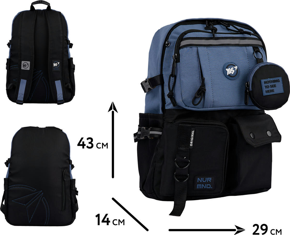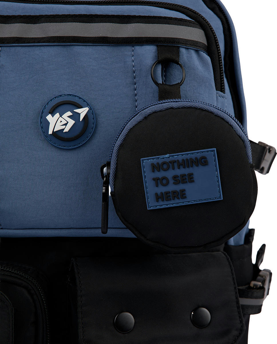 Зовнішніх кишень — аж 8! Бокові — ідеальні для пляшки з водою чи парасольки, потаємна кишеня на спинці — для речей, які потребують захисту від стороннього доступу. Різноманітні передні кишені також знайдуть своє практичне застосування. Рюкзак оснащений ущільненою спинкою та зміцненим дном, що запобігає провисанню і додає конструкції міцності. У моделі використано якісний поліестер і надійну фурнітуру, що гарантує довготривале використання. Контрастне поєднання кольорів надає моделі Yes Т-107 Blue вишуканого та стриманого вигляду. Рюкзак чудово доповнить будь-який образ. Завдяки стильному дизайну й високій функціональності, він стане незамінним супутником у повсякденному житті.