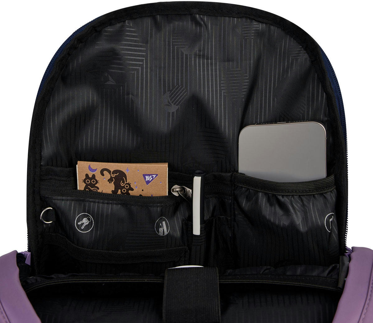 Рюкзак Yes Т-107 має одне просторе відділення, у якому зручно розмістити все необхідне для навчання або подорожі. Продуманий до дрібниць внутрішній органайзер включає окремі кишені для документів, канцелярського приладдя та інших важливих речей. Для мобільного телефону, планшета або ноутбука передбачені спеціальні кишені з м’якою флісовою підкладкою, які забезпечують додатковий захист.