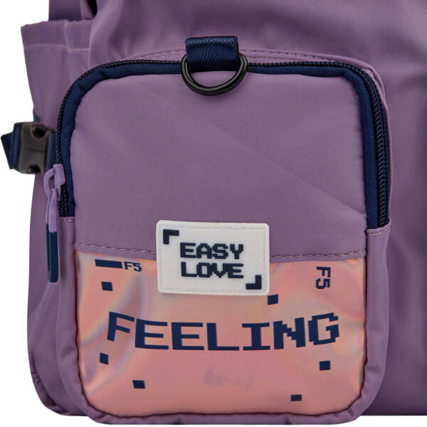 Зовнішніх кишень — аж 8! Бокові — ідеальні для пляшки з водою чи парасольки, потаємна кишеня на спинці — для речей, які потребують захисту від стороннього доступу. Різноманітні передні кишені також знайдуть своє практичне застосування. Рюкзак оснащений ущільненою спинкою та зміцненим дном, що запобігає провисанню і додає конструкції міцності. У моделі використано якісний поліестер і надійну фурнітуру, що гарантує довготривале використання. Стильний колір у поєднанні з голографічним матеріалом у дизайні рюкзаку Yes Т-107 Feeling створює ефектний образ, який миттєво привертає увагу. Оригінальний дизайн підкреслює індивідуальність та сміливий стиль власниці, роблячи цей рюкзак незамінним аксесуаром для яскравої та впевненої в собі дівчинки.