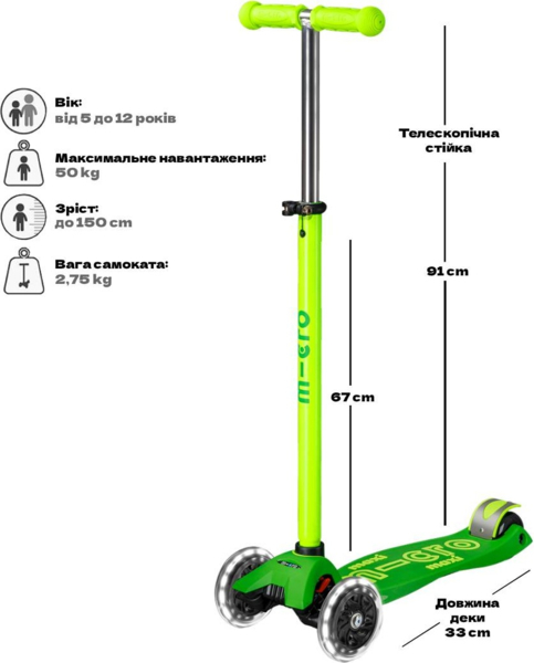 - Самокат Micro серії Maxi Deluxe Neon LED – Зелений папуга (MMD232)