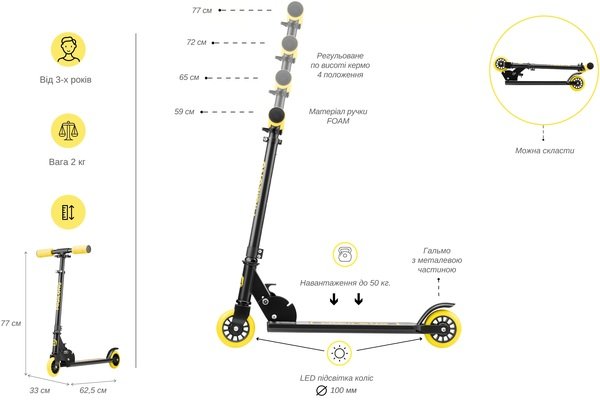- Для зручності переміщення та зберігання конструкція самоката повністю складається.