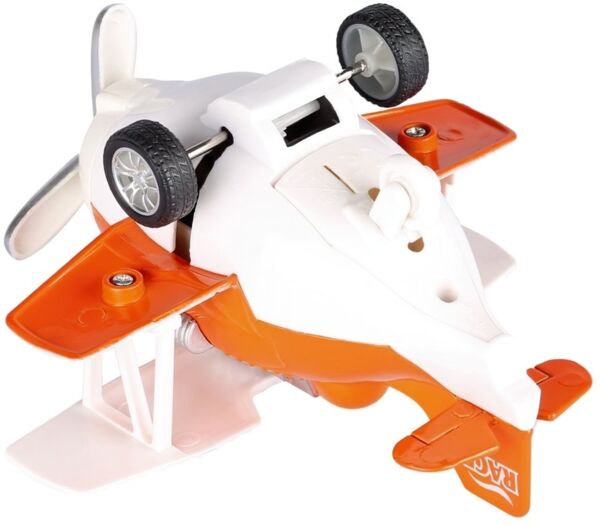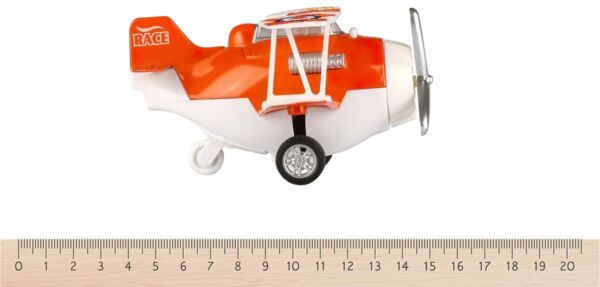 Небольшой размер этой игрушки - её преимущество, удобно ребенку брать с собой на улицу и в садик. Металлический корпус самолета защищает его от повреждений в детских играх. Ярко окрашен в оранжевый и белый цвет, не могу сказать, что краска уж очень стойкая, есть небольшие потертости, но это наверное, нормально. Главное, что сделан он из безопасных для ребенка материалов.