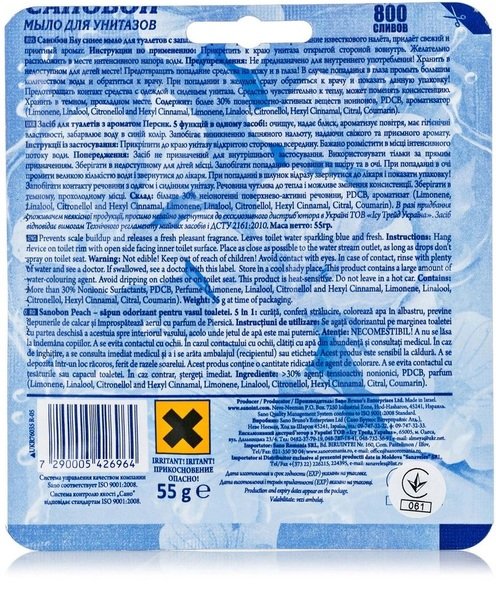 Туалетний блок Sano — засіб для миття та дезінфекції унітазу з різними ароматами. Запобігає утворенню вапняного нальоту, надає свіжого та приємного аромату. 5 функцій в одному засобі: очищає, надає блиску, ароматизує повітря, має гігієнічні властивості та забарвлює воду.
