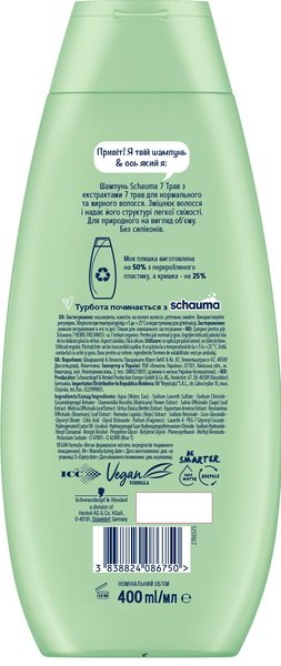 Шампунь Schauma 7 трав для нормального та жирного волосся надає волоссю свіжості та доглянутості з натуральним об'ємом, зміцнюючи структуру волосся.
