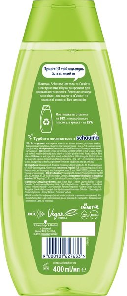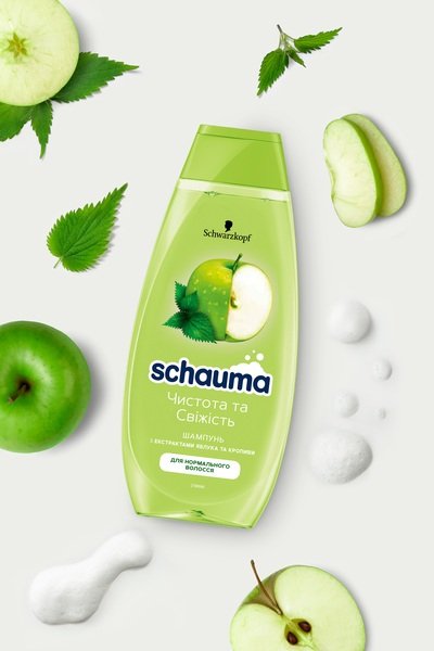 Очистіть і освіжіть волосся шампунем Schauma Чистота і Свіжість з екстрактом зеленого яблука і кропиви для нормального волосся. Веган-формула шампуню не містить парабенів і силіконів, ретельно очищає і освіжає нормальне волосся.