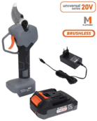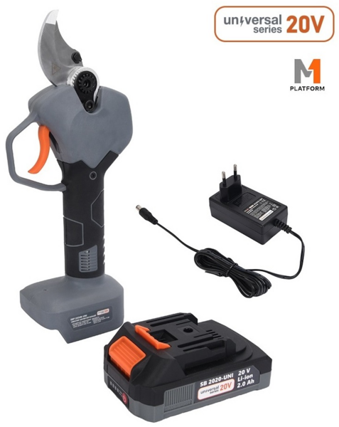 Акумуляторна система напругою 20 В з ємністю 2 А·год забезпечує автономність і мобільність. Секатор підходить для виконання серії операцій без необхідності постійного підключення до електромережі.