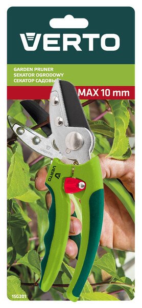 секатор садовий контактний VERTO, довжина 190 мм, діаметр різання до 10 мм. Призначений для підрізування квітів і чагарників. Лезо завдовжки 41 мм з тефлоновим покриттям, що забезпечує захист від корозії. Блокування леза запобігає його розкриття в непередбачених випадках. Ергономічна пластикова рукоятка з антиковзаючим покриттям забезпечує безпеку і комфорт під час роботи. Завдяки вузькому відстані між рукоятками інструмент підходить для жіночої руки.