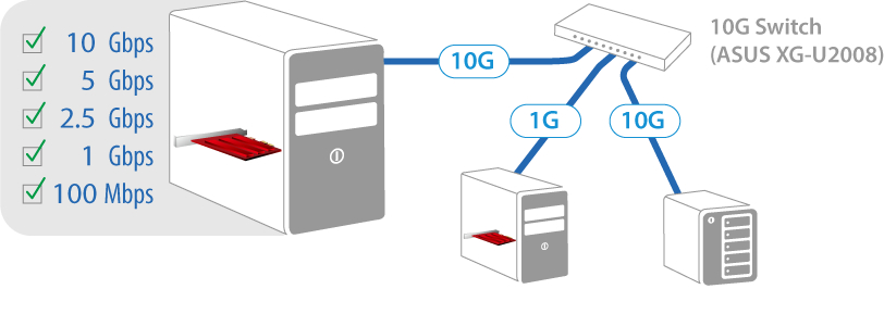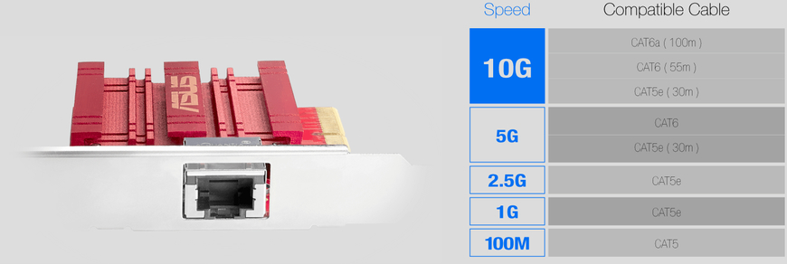 Спеціально для користувачів, яким потрібна збільшена пропускна здатність дротової мережі, ASUS пропонує XG-C100C – адаптер стандарту 10G Ethernet, який забезпечує швидкість передачі даних до 10 Гбіт/с, що в 10 разів перевищує можливості широко поширених адаптерів Gigabit Ethernet.